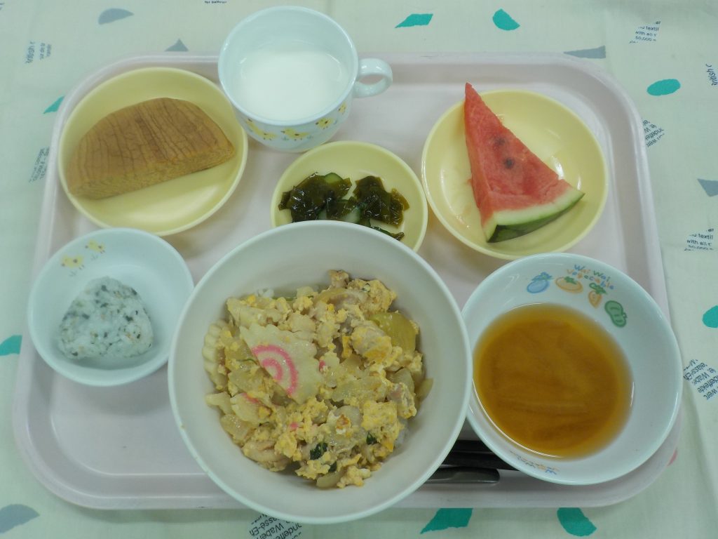 親子丼・酢の物・大根のみそ汁・スイカ