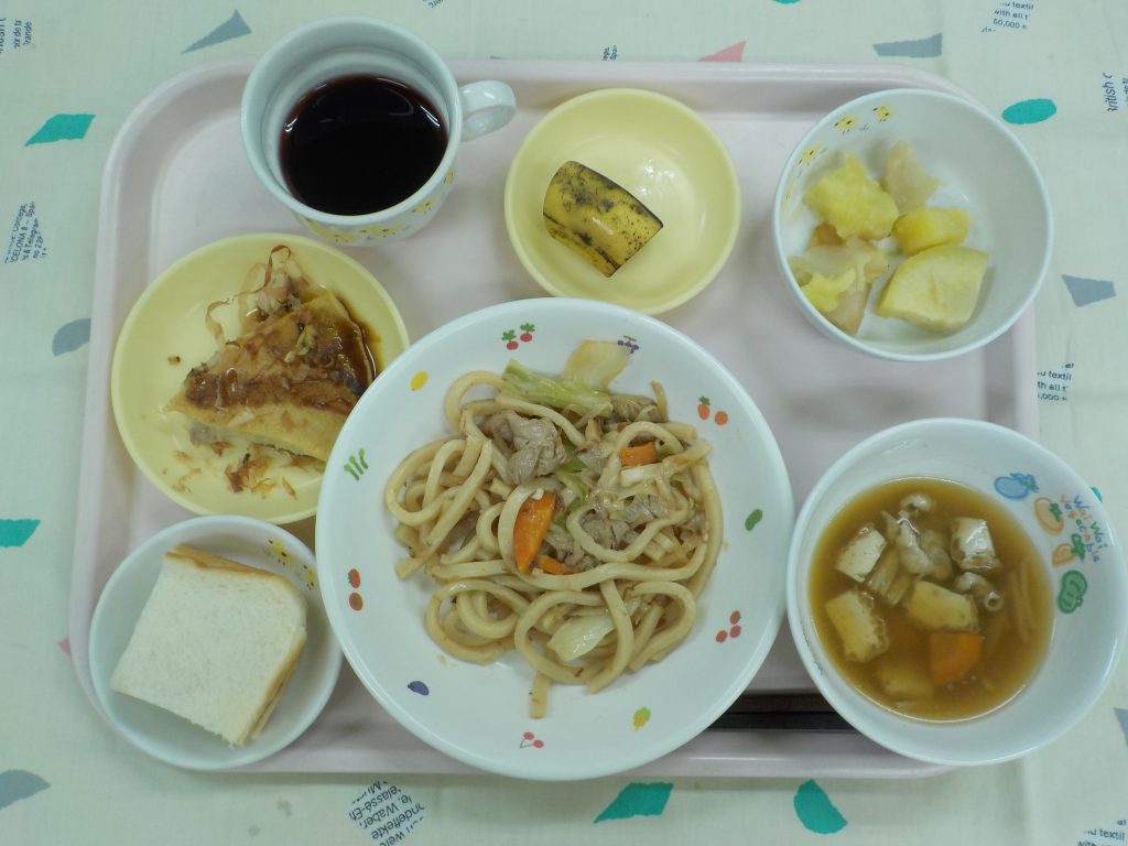 焼きうどん・さつま芋とりんごの重ね煮・鶏ごぼう汁・バナナ