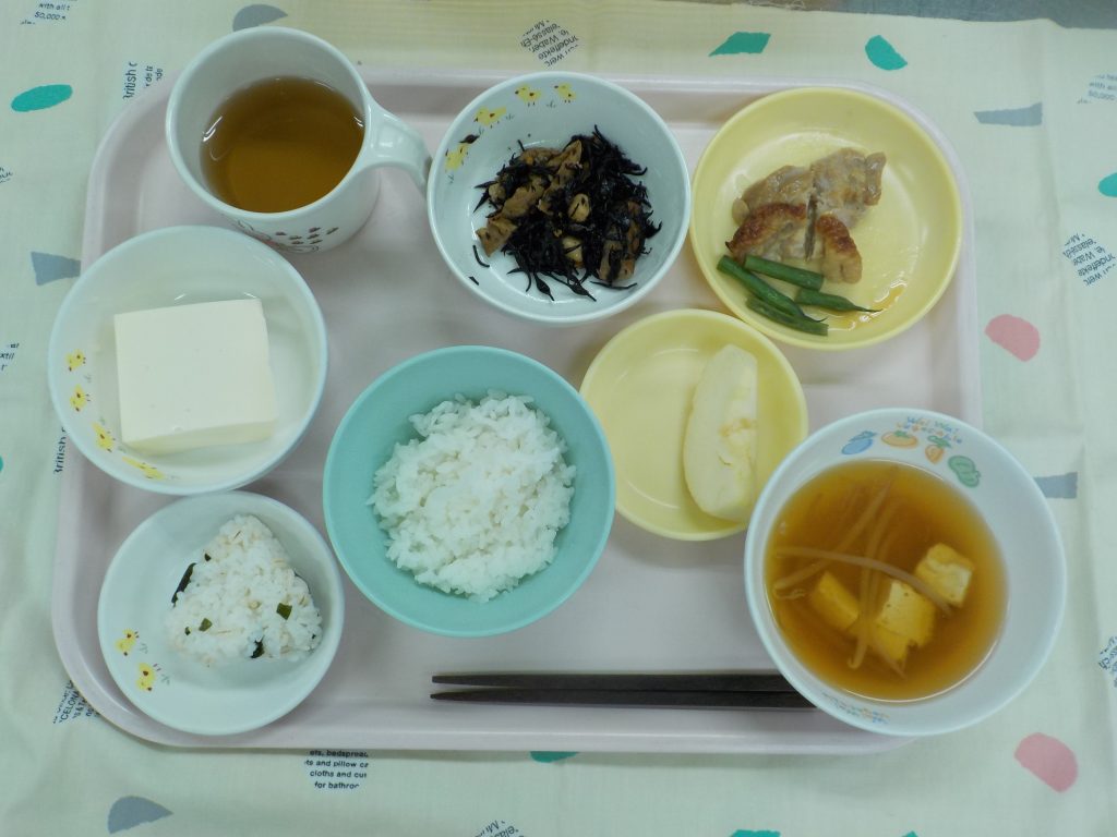 ごはん・鶏肉の照り焼き・ひじきの煮物・もやしのみそ汁・りんご