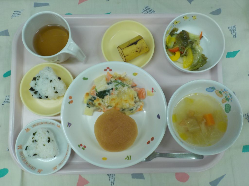 ミルクロール・鮭とほうれん草のポテトグラタン・フレンチサラダ・ひよこ豆のカレースープ・バナナ