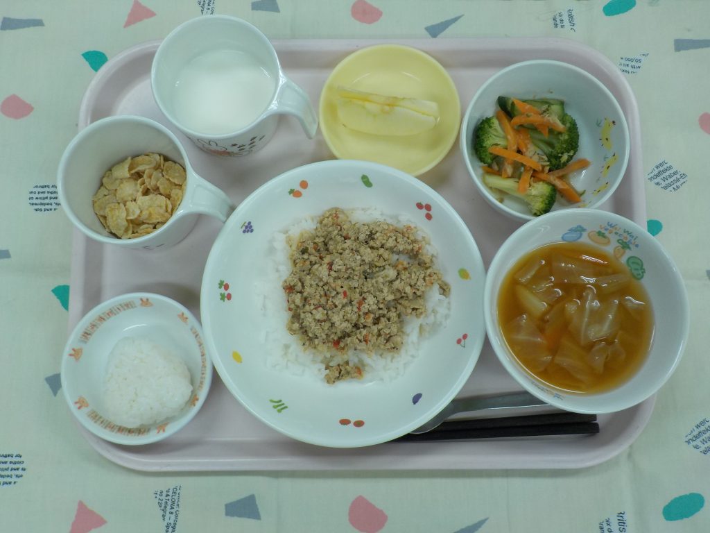 鶏肉のガパオ炒めご飯・ブロッコリーサラダ・キャベツのみそ汁・りんご