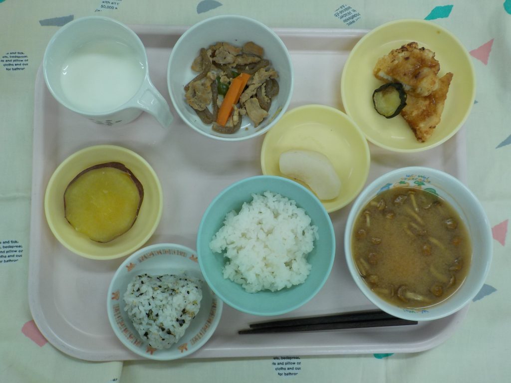 ごはん・カジキのあずま煮・豚肉とこんにゃくの炒め物・豆腐となめこのみそ汁・梨