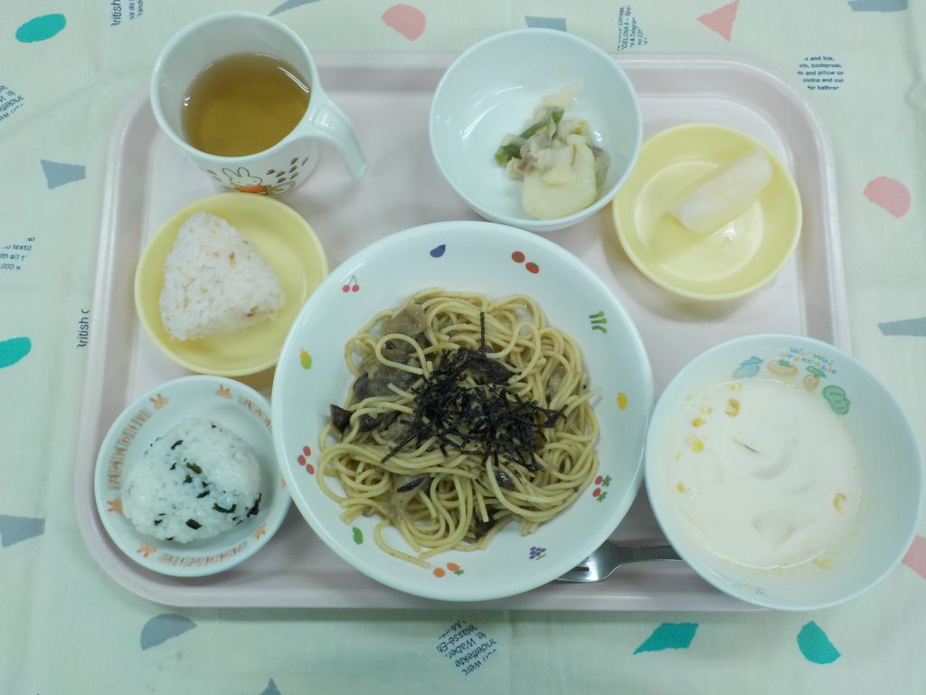 なすとベーコンと舞茸のスパゲティー・ジャーマンポテト・コーンスープ・りんご