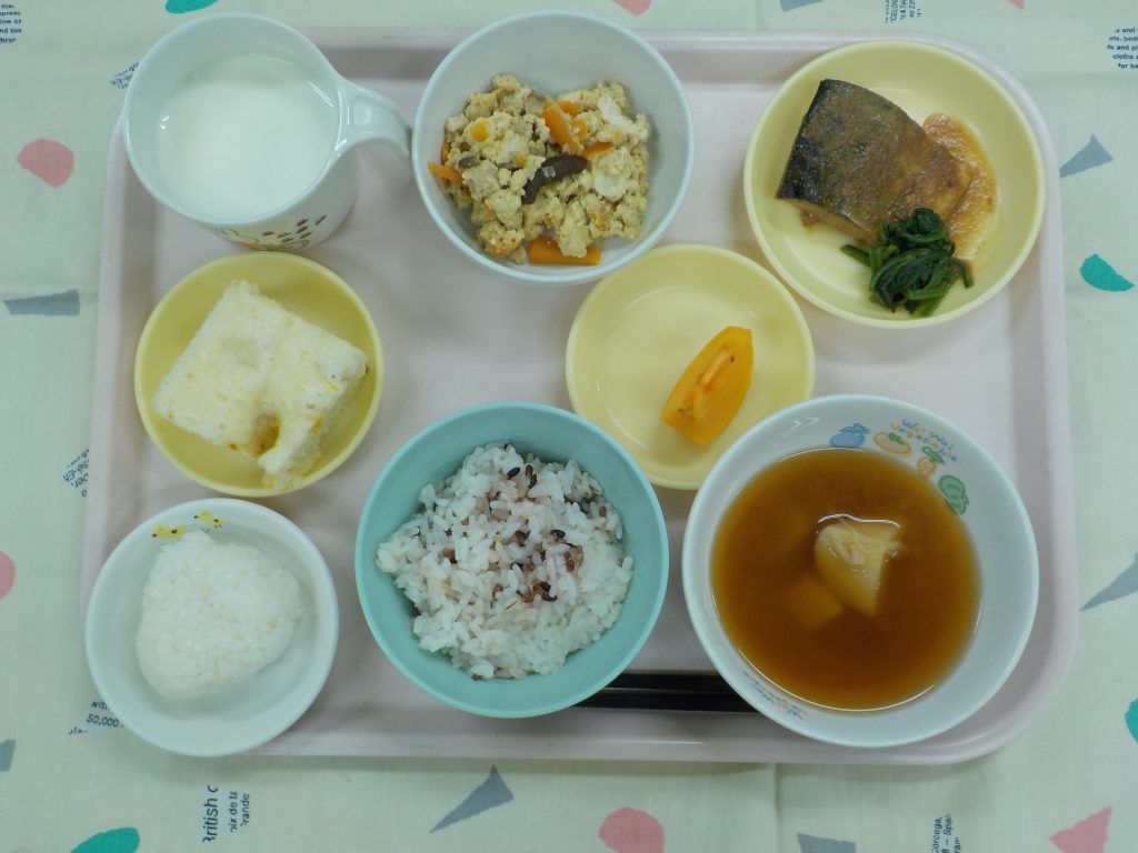 五穀ご飯・鯖のみそ煮・炒り豆腐・じゃがいものみそ汁・柿