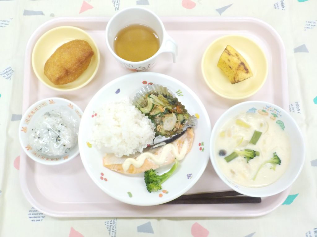 ごはん・鮭のマヨネーズ焼き・ツナサラダ・秋野菜のみそ風味シチュー・バナナ