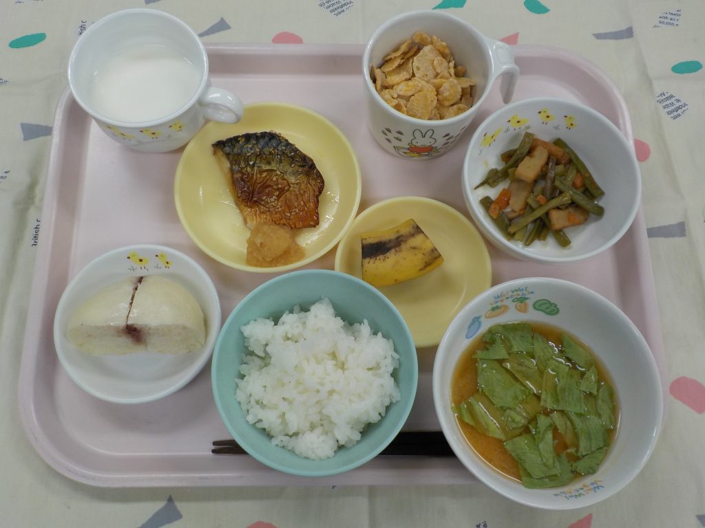 ごはん・鯖のみりん干し焼き・いんげんの炒め煮・レタスのみそ汁・バナナ
