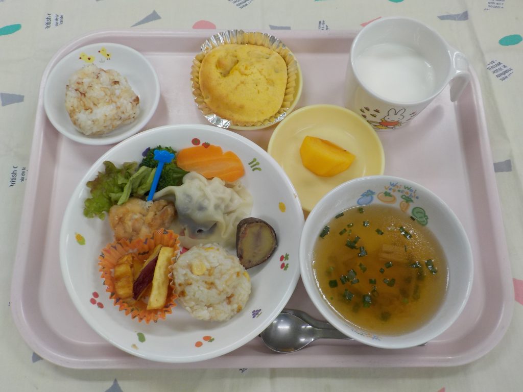 ピラフ・おばけ餃子・から揚げ・スティックおさつ・ゆで栗・スープ・柿