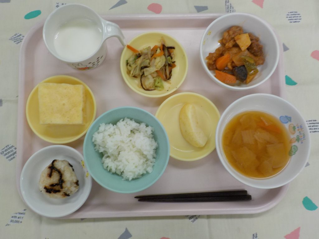 ごはん・酢豚・キャベツの塩昆布和え・白菜のみそ汁・りんご