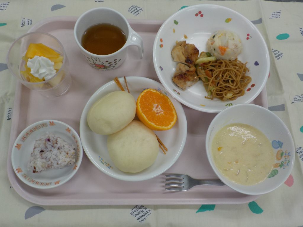 塩パン・チキンロースト・焼きそば・ポテトサラダ・コーンスープ・みかん