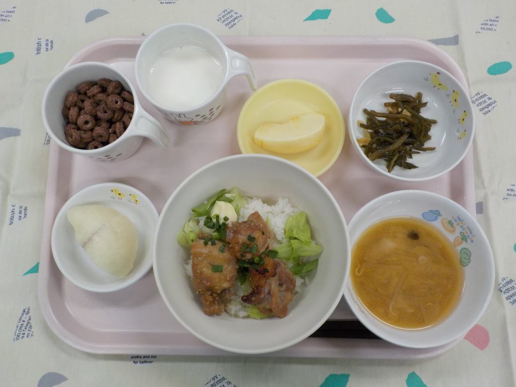 鶏肉のごまだれ丼・茎わかめの炒り煮・もやしのみそ汁・りんご