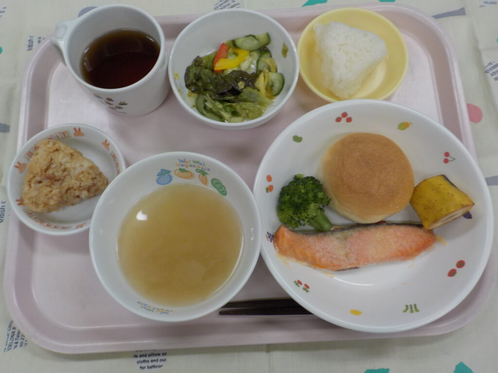 ブリオッシュ・鮭のムニエル・フレンチサラダ・オニオンスープ・バナナ