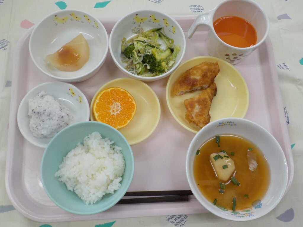 ごはん・ささみのレモン煮・じゃこサラダ・じゃがいものみそ汁・みかん