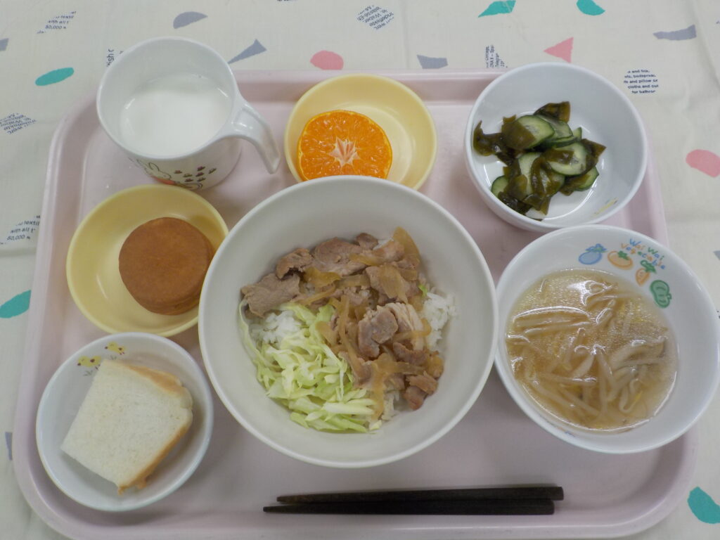 豚肉のしょうが焼き丼・酢の物・中華スープ・みかん