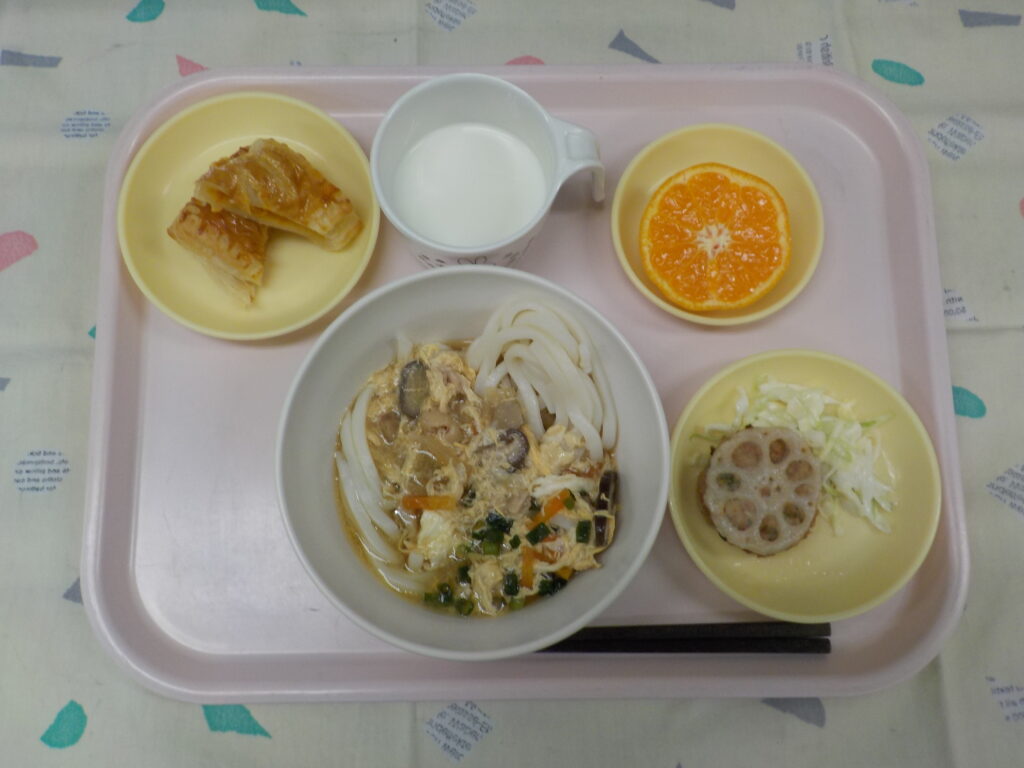 かきたまうどん・れんこんのはさみ揚げ・みかん