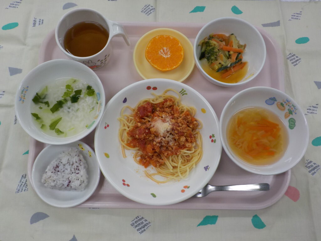 ミートソーススパゲティー・ブロッコリーサラダ・ジュリアンスープ・みかん