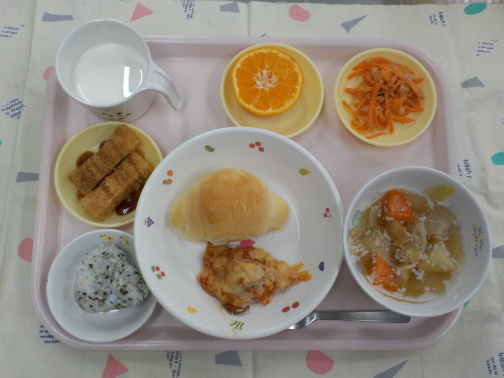 塩バターパン・タラのピザ焼き・人参サラダ・ウインナーと野菜のスープ・みかん