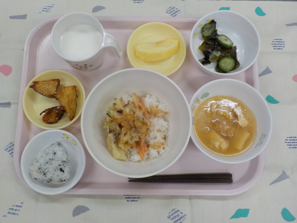 かき揚げ丼・酢の物・八宝菜みそ汁・りんご