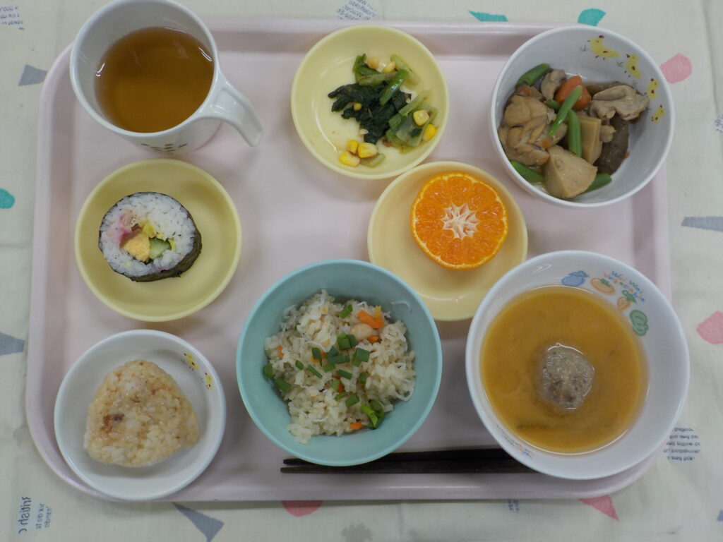大豆ごはん・炒り鶏・小松菜のおかか和え・イワシのつみれ汁・みかん