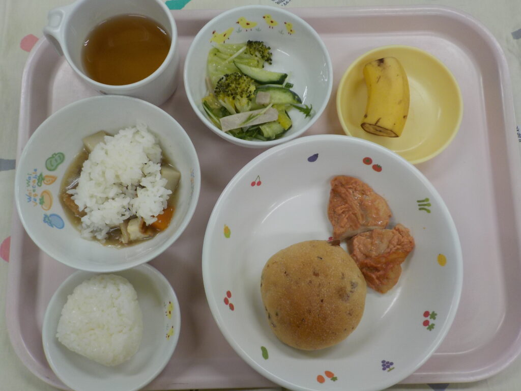 ぶどうパン・タンドリーチキン・グリーンサラダ・クリームシチュー・バナナ
